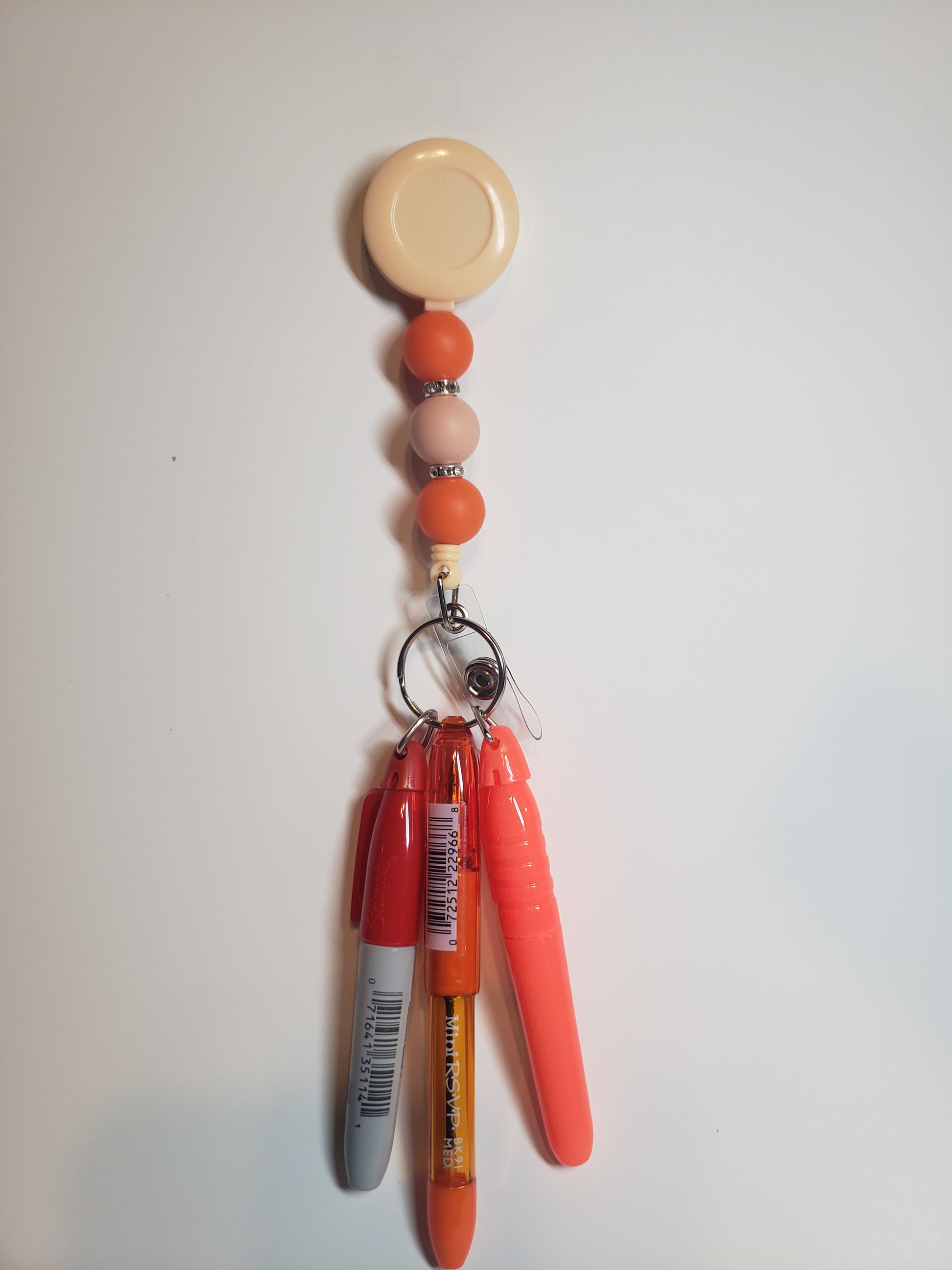 Perfect for anyone who must wear an ID badge at work or school. All badge reels are handcrafted using a variety of silicone beads and/or crystal beads. Bead colors will be best matched with reel color. Each reel will come with 1 mini highlighter, 1 mini permanent marker, and 1 mini pen that best fits the color scheme of the badge reel design.