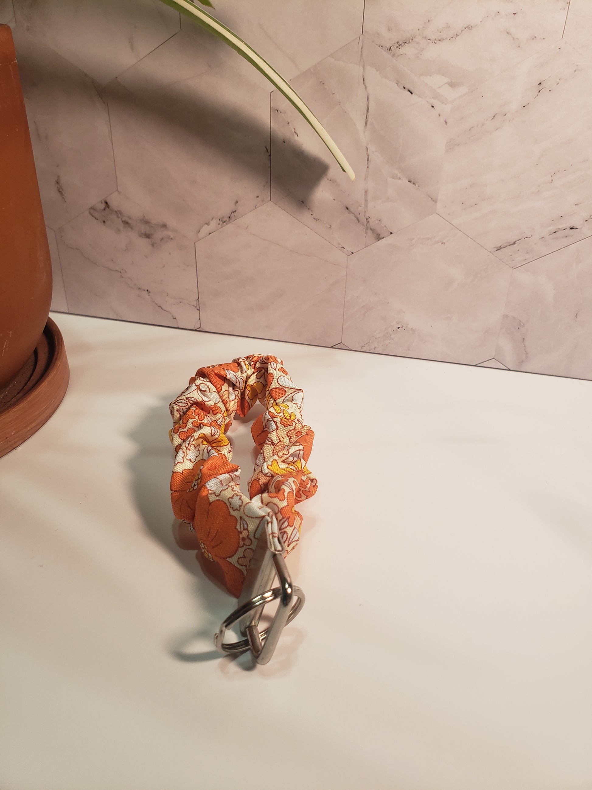 This scrunchie wristlet is perfect for holding your car keys, work keys, or makes the perfect wallet accessory . This wristlet also makes an easy and unique gift for teachers, coworkers, neighbors, friends or for yourself. Each wristlet is made from 100% cotton, an 8.5 inch elastic band, and a piece of silver hardware that contains a key ring.