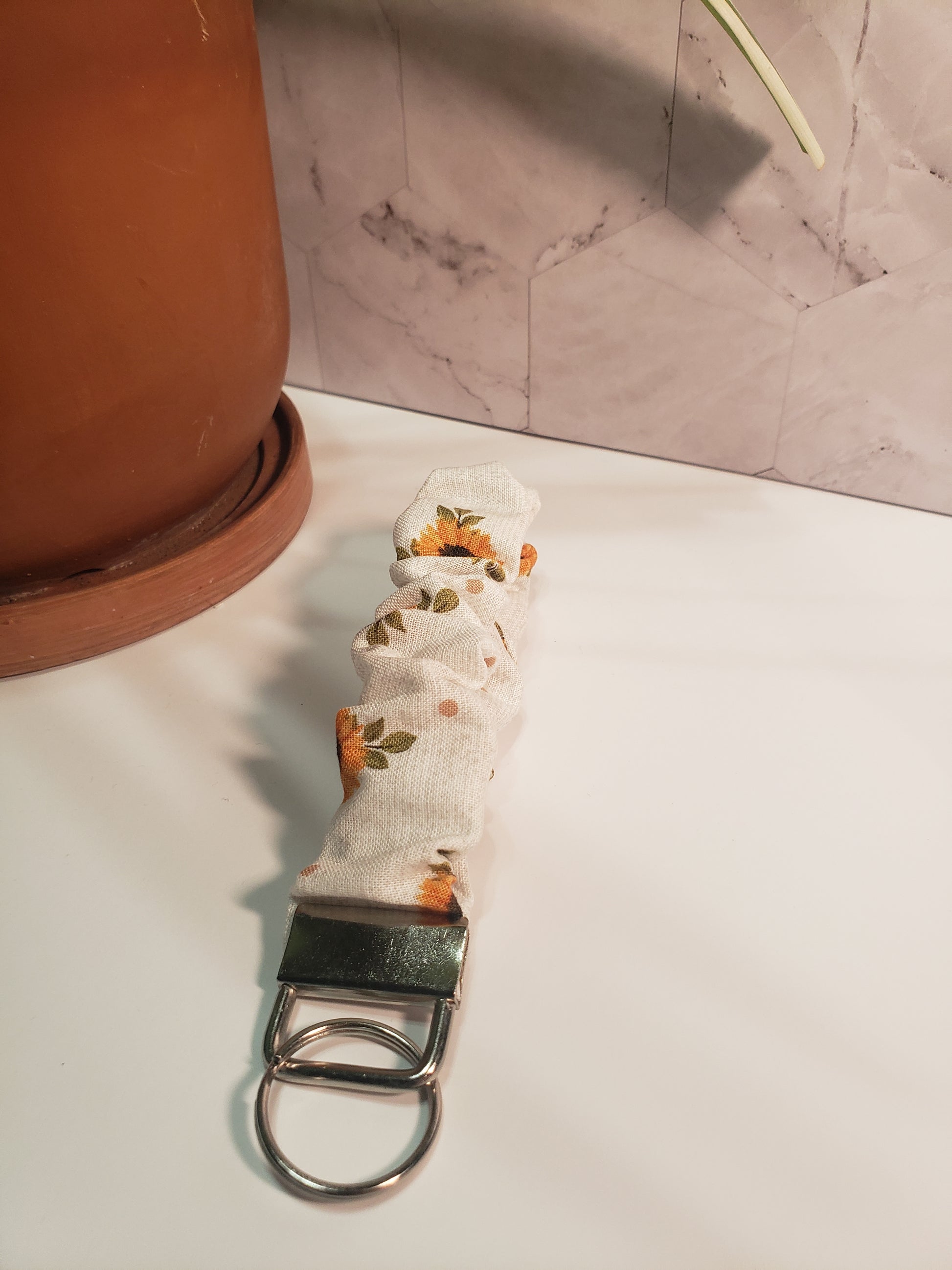 This scrunchie wristlet is perfect for holding your car keys, work keys, or makes the perfect wallet accessory . This wristlet also makes an easy and unique gift for teachers, coworkers, neighbors, friends or for yourself. Each wristlet is made from 100% cotton, an 8.5 inch elastic band, and a piece of silver hardware that contains a key ring.